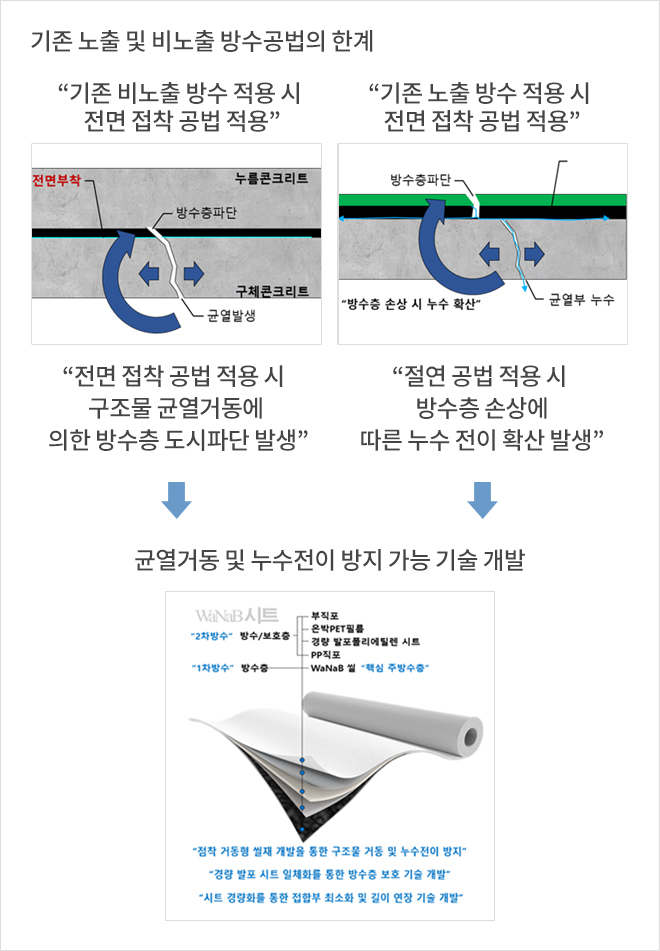 균열 거동 대응성이 확보된 점착 거동형 씰재과 경량의 폴리에틸렌(Polyethylene) 발포 보호재를 합지한 시트방수재를 바탕면에 전면부착하여 시공함으로써 기존기술에서의 누수전이 및 바탕면 균열에 따른 방수층의 동시파단 발생을 근본적으로 해결함과 동시에 저온환경 및 습윤환경, 자기보수성 확보를 통해 안정적인 방수층의 형성이 가능한 것과 WaNaB 시트재 간 접합부 상부에 연질의 절연 광폭 테이프를 적용하여 시트층과의 절연구조를 형성함으로써 접합부 하부 바탕면의 균열 거동 발생 시 무절점인장응력 (Zero Span-tension)에 의한 접합부 동시파단 문제를 해결하여 방수층 전체의 장기적 안정성을 향상시킨 복합방수기술이다.